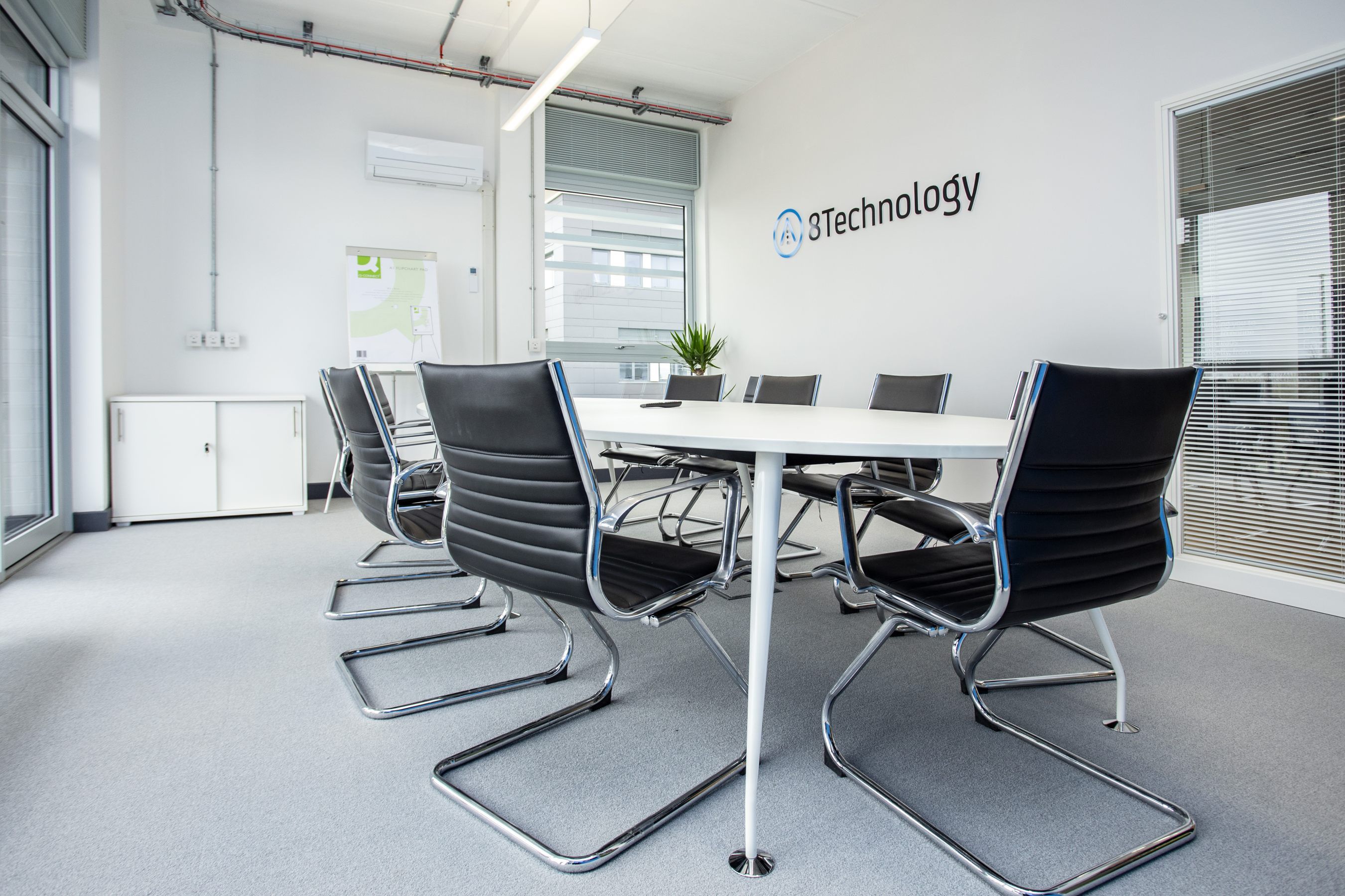 New boardroom with white oval table, leather chairs & signage