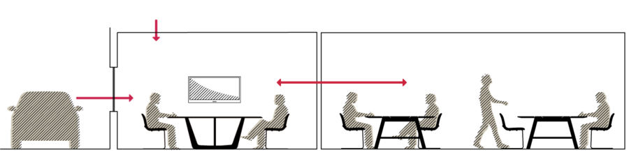 Whether for visual or acoustic privacy, we suggest options such as phone booths or privacy booths. You may also consider free-standing elements, e.g. room dividers, or desk partitions to divide areas and mitigate sound transfer between specific zones.