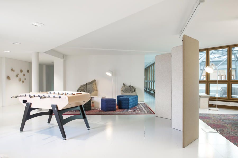 If, on the other hand, no such soft materials exist and your space is dominated by hard surfaces, e.g. concrete, glass, and metal, you need to bring in more soft, absorbing materials to compensate for the hard surfaces. For instance, add flexible upholstered poufs or consider acoustic lighting and ceiling applications in case your walls are already occupied by shelving systems and art.