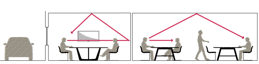 Think of a regular meeting room with a medium-sized conference table in the middle. As people start talking, the sound waves from their conversations will typically first hit the walls or the ceiling depending on the height. In this case, to prevent the sound from bouncing back-and-forth between the walls, we’re looking to apply absorbing materials to the walls.